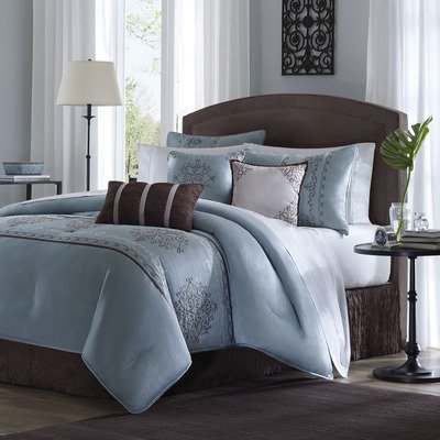 MP10-036 Size: California King Features: -Material: 100pct Polyester.-Dupioni with embroidery.-Made from a faux silk fabrication.-Elegant motif on the bed is all embroidery. Options: -Available in Queen, King or California King sizes. Color/Finish: -Color: Blue.