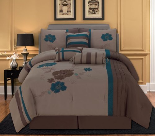 This elegant comforter set features floral embroidery with pleated details on taupe ground. 3 unique decorative pillows further enhance the look .