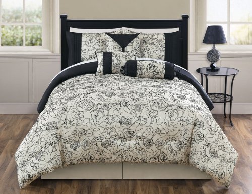 This elegant comforter set features floral flocking on ivory ground, an eclectic set that will be great for any bedroom. 3 decorative pillows included.