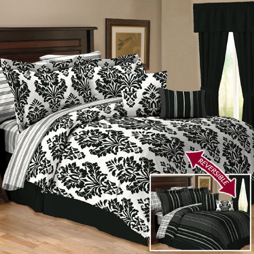 Get 20 different looks with the Cosmopolitan Reversible 10 Piece Bedding Set. The Set Includes: 1 Reversible Comforter, 1 Bedskirt, 2 Reversible Pillow Shams, 2 Reversible Pillowcases, 1 Reversible Flat Sheet, 1 Reversible Fitted Sheet and 2 Reversible Decorative Pillows. Both fitted and flat sheets reverse from head to foot for a completely different look.?