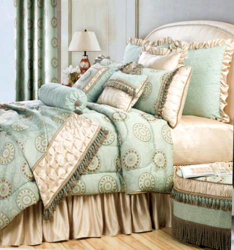 Jennifer Taylor 4-piece Comforter Set, California King Size, FORTUNE Collection, Seamiest Green, (Includes 1 Comforter 104''X96'', 1 Bed Skirt 72''X84''+18'', 2 King Sham 21''X37'').